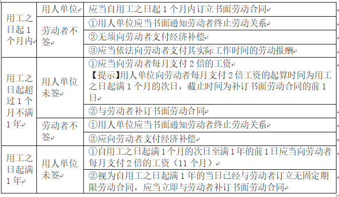 选项 A.用人单位应当自用工之日起1个月内订立书面劳动合同 B.劳动者自用工之日起1个月内不与用人单位订立书面劳动合同的,用人单位应当书面通知劳动者终止劳动关系,无须向劳动者支付经济补偿和实际工作时间的劳动报酬 C.用人单位自用工之日起超过1个月不满1年未与劳动者订立书面劳动合同的,应当自用工之日起至补订书面劳动合同的前1日向劳动者每月支付2倍的工资 D.用人单位自用工之日起超过1个月不满1年未与劳动者订立书面劳动合同的,应当与劳动者补订书面劳动合同,劳动者不与用人单位订立书面劳动合同的,用人单位应当书面通知劳动者终止劳动关系,并支付经济补偿 E.用人单位自用工之日起满1年未与劳动者订立书面劳动合同的,自用工之日起满1个月的次日至满1年的前1日应当向劳动者每月支付2倍的工资 F.用人单位自用工之日起满1年未与劳动者订立书面劳动合同的,视为自用工之日起满1年的当日已经与劳动者订立无固定期限劳动合同,应当立即与劳动者补订书面劳动合同