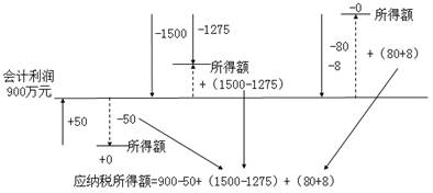 解析 (1)国债利息收入50万元为免税收入,应当纳税调减;(2)实际发生的广告费支出超过扣除限额,超过部分(1500-1275)在本年度应当纳税调增;(3)非广告性赞助支出80万元、计提的坏账准备金8万元不得扣除,应当纳税调增。具体处理参考下图: