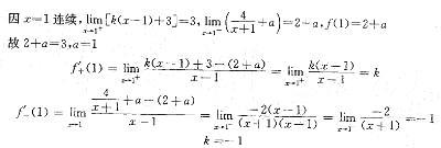 若f(x)在点x=1连续而且可导,则k的值是: A. 2 B. -2 C.-1 D. 1