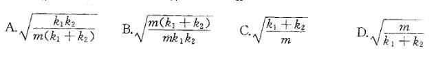 图示质量为m的物块,用两根弹性系数为k1和k2的弹簧连接,不计阻尼,当物体受到干扰力F=hsinωt的作用时,系统发生共振的受迫振动频率ω为: