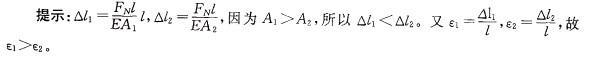 两拉杆的材料和所受拉力相同,且均处在弹性范围内,若两杆长度相等,横截面面积义A1>A2,则: