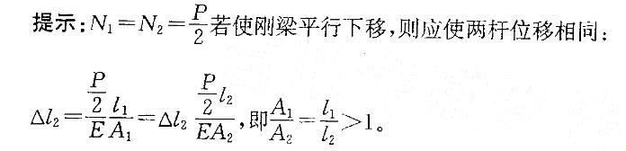图示刚梁AB由标1和杆2支承。已知两杆的材料相同,长度不等,横截面面积分别为A1和A2,若荷载P使刚梁平行下移,则其横截面面积: A. A12 B....