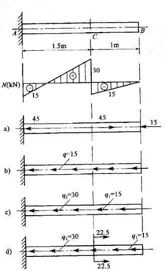 解析 提示:由轴力图(N图)可见,轴力沿轴线是线性渐变的,所以杆上必有沿轴线分布的均布荷载,同时在C 截面两侧轴力的突变值是45kN,故在C 截面上一定对应有集中力45kN。