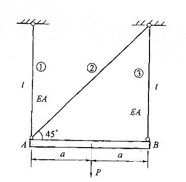 问题 结构受力如图所示。若用N1,、N2、N3和匕分别代表杆①、②、③的轴力和伸长,用表示点A的水平位移和竖直位移,则下列结论中正确的是: