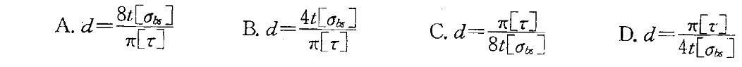 已知铆钉的许可切应力为,许可挤压应力为,钢 板的厚度为t,则图示铆钉直径d与钢板厚度t的关系是: