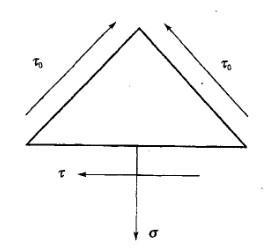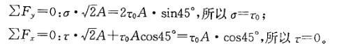 问题 图示为等腰直角三角形单元体,已知两直角边表示的截面上只有剪应力, 且等于τ0,则底边表示截面上的正应力σ和剪应力τ分别为: