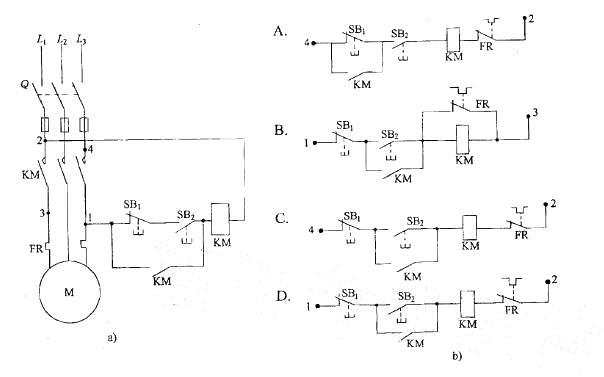 问题 如图a)所示控制电路的错误接线不能使电动机M起动。要使M起动并能连续运转,且具备过载保护、失压保护、短路保护的功能,正确的接线是图b)中哪个图所示?