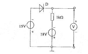 问题 在图示的二极管电路中,设二极管D是理想的(正向电压为0V,反向电流为0A),且电压表内阻为无限大,则电压表的读数为: A. 15V B. 3V C. -18V D. -15V