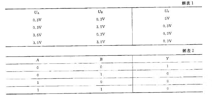 解析 提示:当UA或UB中有高电位时,u01输出高电位,u01与UA、UB符合或门逻辑电路。u0与u01的电位关系符合非门逻辑,因此,该电路的输出与输入之间有或非逻辑。电位分析如解表1和解表2所示。
