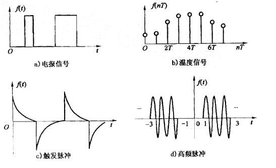 图示为电报信号、温度信号、触发脉冲信号和高频脉冲信号的波形,其中是连续 信号的是: A. a)、c)、d) B. b)、c)、d) C. a)、...