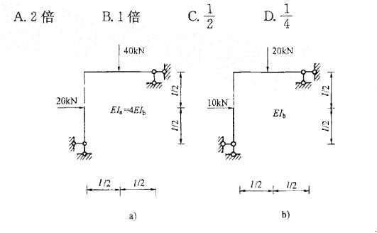 问题 图示两刚架的EI均为常数,已知EIa=4EIb,则图a)刚架各截面弯矩与图b)刚架各相应截面弯矩的倍数关系为: