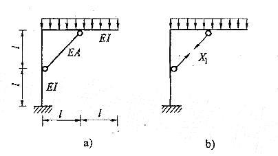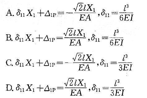 问题 如图a)所示结构,若将链杆撤去,取图b)为力法基本体系,则力法方程及知分别为: