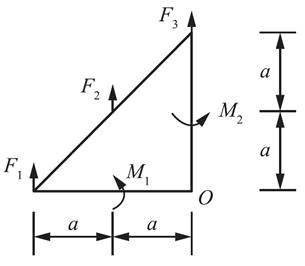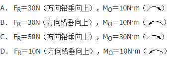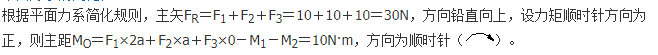 问题 在图示平面力系中,己知:力F1=F2=F3=10N,a=1m,力偶的转向如图所示,力偶距的大小为M1=M2=10N·m。则力系向O点简化的主矢、主距为(  )。