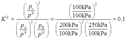 问题 某温度下,在密闭容器中进行如下反应2A(g)+B(g)2C(g),开始时p(A)=p(B)=300kPa,p(C)=0kPa,平衡时,p(C)=100kPa,在此温度反应的标准平衡常数K是(  )。