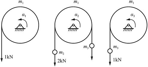 问题 质量m1与半径r均相同的三个均质滑轮,在绳端作用有力或挂有重物,如图所示。已知均质滑轮的质量为m1=2kN·s^2/m,重物的质量分别为m2=2kN·s^2/m,m3=1kN·s^2/m,重力加速度按g=10m/s^2计算,则各轮转动的角加速度α间的关系是(  )。