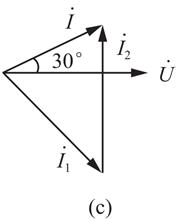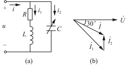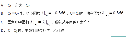 问题 图(a)所示功率因数补偿电路中,C=C1时得到相量图如图(b)所示,C=C2时得到相量图如图(c)所示,那么(  )。
