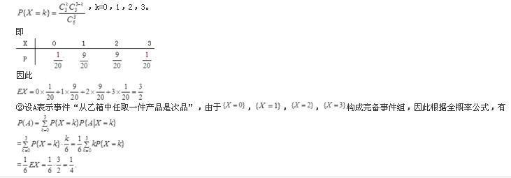 解析 乙箱中可能的次品件数为0,1,2,3,分别求出其概率,再按定义求数学期望即可;而求从乙箱中任取一件产品是次品的概率,涉及到两次试验,是典型的用全概率公式的情形,第一次试验的各种可能结果(取到的次品数)就是要找的完备事件组. ①X的可能取值为0,1,2,3,X的概率分布为