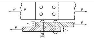 解析 每个铆钉承担的作用力为P/4,每个铆钉的剪切面均为直径为d的圆,则由剪应力公式 挤压面面积为dt,则由挤压强度公式