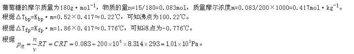 在20℃时,将15.0g葡萄糖(C6H12O6)溶于200g水中,该溶液的冰点(Kfp=1.86℃)、正常沸点(Kbp=0.52℃)、渗透压(设M=m)分...