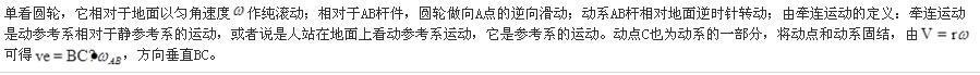 如图,半径为R的圆轮以匀角速度作纯滚动,带动AB杆绕B作定轴转动,D是轮与杆的接触点,如图所示。若取轮心C为动点,杆BA为动坐标系,则动点的牵连速度为( ...