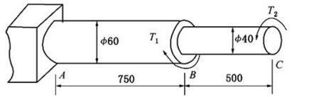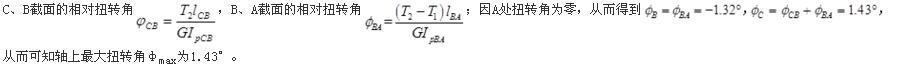 变截面圆轴如图所示。已知T1=2kN·m,T2=1kN·m,G=80GPa,此轴的最大扭转角φmax为(  )。 A.1.27° B.1.43° C...