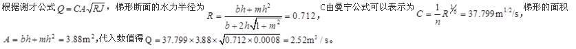 问题 某梯形断面明渠均匀流,渠底宽度b=2.0m,水深h=1.2m,边坡系数m=1.0,渠道底坡i=0.0008,粗糙系数n=0.025,则渠中的通过流量Q应为(  )。