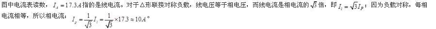 问题 在图示电路中,对称负载联成△形,已知电流表的读数IA=17.3A。则每相负载中的电流是(  )。