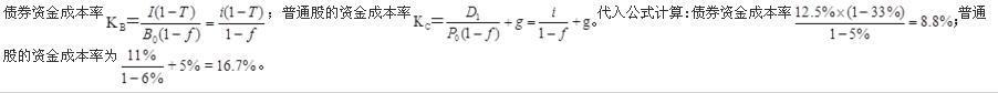 问题 某公司拟用债券和普通股两种方式融资,其中债券的融资费率为5%,利息率为12.5%;普通股筹资费率为6%,第一年股利率为11%,以后每年增长5%。该公司所得税率为33%,则债券与普通股的资金成本率分别为(  )。