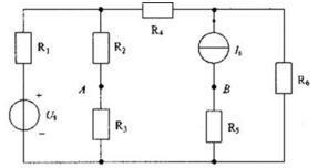 电路如图所示,已知:R1=6Ω,R2=R3=3Ω,R4=2Ω,R5=8Ω,R6=10Ω,Us=18V,Is=3A,则A、B两点间的电压UAB是(  )V。...