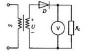 单相半波整流电路如图所示,已知变压器副边电压为U(t)=28.28sin(ωt+ψ)V,设D为理想二极管,直流电压表的读数是(  )V。 A.9.00 ...