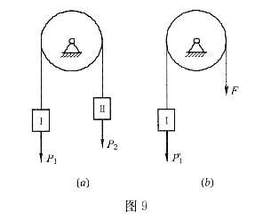 图9中鼓轮质量不计,P1,P2,F大小相同,系统处于平衡状态。问在下述两种情况下图(a)、图(b)中悬挂重物Ⅰ的绳的张力是否相等?( )(1)在轮上加一相...