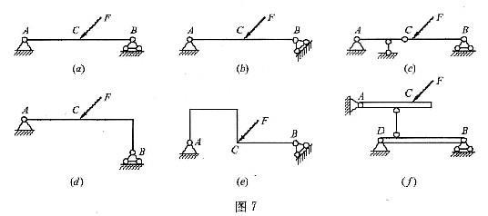 问题 如图7所示各种情况下,力F的作用点为C,力F与水平线的夹角都相等,各杆重量不计。设AC和BC的水平距离都相等,试指出哪些情况A处约束力相同。( )