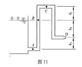 问题 管道流动见图15,管径d=150mm、喷嘴出口直径dD=50mm,各点高差h1=2m、h2=4m、h3=3m,不计水头损失,则C点压强为( )。