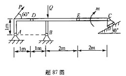 图示结构中,各构件的自重不计,已知:力偶矩的大小m=60kN·m,其转向为顺时针方向:Q=60kN,方向铅直向下; kN,方向如图示。支座A...