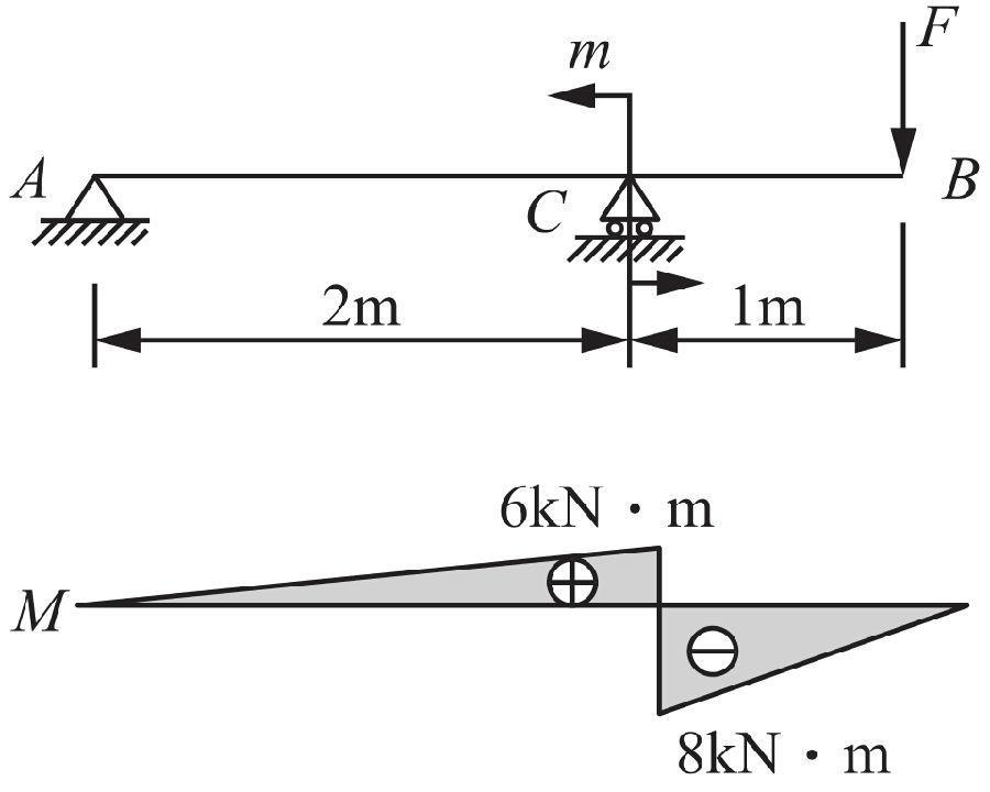外伸梁AB的弯矩图如右下图所示,梁上载荷(右上图)F、m的值为(  )。 A、F=8kN,m=14kN·m B、F=8kN,m=6kN·m ...
