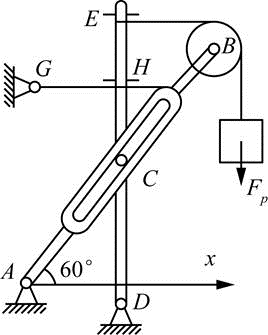 机构如图,杆ED的点H由水平绳拉住,其上的销钉C置于杆AB的光滑直槽中,各杆重均不计。已知Fp=10KN。销钉C处约束力的作用线与轴正向所成的夹角为(  ...
