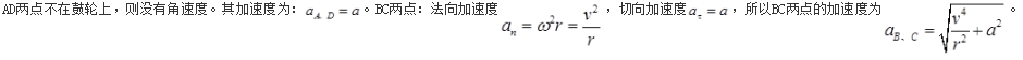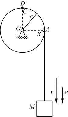 问题 一绳缠绕在半径为r的鼓轮上,绳端系一重物M,重物M以速度v和加速度a向下运动(如图)。则绳上两点A、D和轮缘上两点B、C的加速度是(  )。