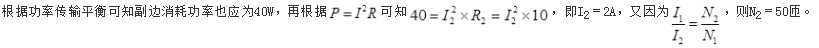 图示变压器为理想变压器,且N1=100匝,若希望I1=1A时,PR2=40W,则N2应为(  )。 A、50匝 B、200匝 C、25匝 D、...