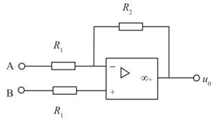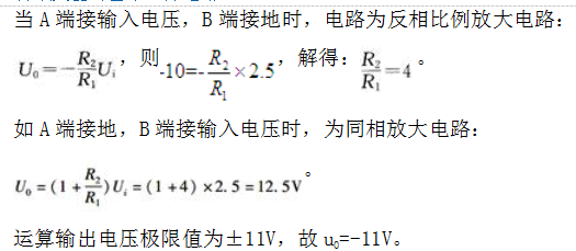 问题 运算放大器应用电路如图所示,设运算输出电压的极限值为±11V,如果将-2.5V电压接入“A”端,而“B”端接地后,测得输出电压为10V;如果将-2.5V电压投入“B”端,而“A”端接地,则该电路的输出电压u0等于(  )。