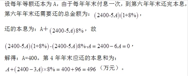 问题 某公司向银行借款2400万元,期限为6年,年利率为8%,每年年末付息一次,每年等额还本,到第6年末还完本息。请问该公司第4年年末应还的本息和是(  )。