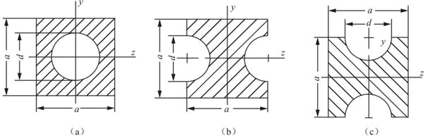 解析 (a)、(b)两图对z轴的截面惯性矩计算,分为两部分:圆弧之上的矩形部分和圆弧部分,圆弧部分对z轴的惯性矩相等,矩形部分对z轴的惯性矩需要采用平移轴定理,二者面积相同,计算结果也相同,故 对于(c)图,矩形部分不用平移轴定理,圆弧部分用平移轴定理,显然