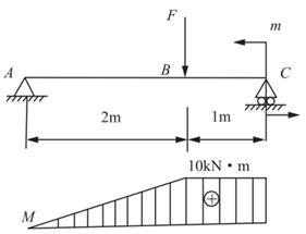 解析 弯矩图在支座C处有一个突变,突变大小即为支座C处的弯矩值,m=10kN·m。弯矩图的斜率值即为剪力值,显然BC段截面剪力为零,AB段截面剪力为+5kN(顺时针),因此根据B点截面处的竖向力平衡,可算得:F=5kN。