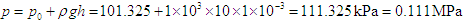 解析 一个标准大气压为:p0=101.325kPa,则自由液面下1m处的绝对压强: