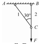 图示结构的两杆面积和材料相同,在铅直向下的力F作用下,下面正确的结论是(  )。 A、 C点位移向下偏左,1杆轴力不为零 B、 C点位移向下偏左,1...