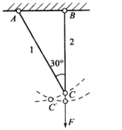 解析 首先取节点C为研究对象,根据节点C的平衡可知,杆1受力为零,杆2的轴力为拉力F;再考虑两杆的变形,杆1无变形,杆2受拉伸长。由于变形后两根杆仍然要连在一起,因此C点变形后的位置,应该在以A点为圆心,以杆1原长为半径的圆弧,和以B点为圆心、以伸长后的杆2长度为半径的圆弧的交点C'上,如图所示。显然这个点在C点向下偏左的位置。