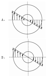 解析 图示为受扭空心圈轴,空心处不受力,故A项错误。由最大切应力公式 {图} 在空心圆中, {图1} 切应力呈线性分布,且与到圆心的距离呈正比。所以得到如图B所示的切应力分布。