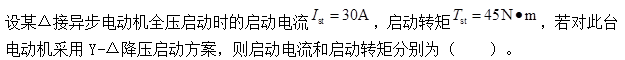 解析 三相异步电动机启动的主要问题是启动电流大和启动转矩小。三相异步电动机的启动电流为额定电流的4~7倍,这么大的电流对非频繁启动的电动机本身来讲,由于启动时间很短,不会造成过热,但会使线路上电压降大增,从而使负载端电压降低,影响临近负载的工作,也使电网电压波动很大,所以有必要采取措施来降低启动电流。此外,对于重载启动电动机,如果其启动转矩不足以启动还要设法提高其启动转矩。 常用的降压启动方法有Y-Δ降压启动和自耦变压器降压启动。采用Y-Δ换接启动的电动机正常运行时为三角形接法,启动时接成星形,Y-Δ降压启动的启动电流和启动转矩分别是全压启动时启动电流和启动转矩的1/3。 因此,此台电动机降压启动的启动电流 启动转矩 注:此法仅适用于空载或轻载启动的情况。