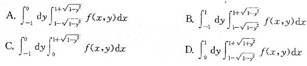 解析 解:本题考查二重积分交换积分次序方面的知识。解这类题的基本步骤:通过原积分次序画出积分区域的图形,得到积分区域;然后写出先x后y的积分表达式。
