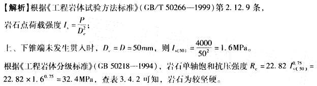 取直径为50mm、长度为70mm的标准岩石试件,进行径向点荷载强度试验,测得破坏时的极限荷载为4000N,破坏瞬间加荷点未发生贯入现象。试分析判断该岩石的...