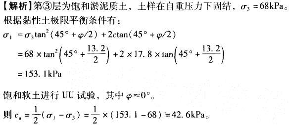 问题 某基坑的地基土层分布如图1-3所示,地下水位在地表以下0.5m。其中第①、②层的天然重度γ=19kN/m3,第③层淤泥质土的天然重度为17. 1kN/m3,三轴固结不排水强度指标为:ccu=17.8kPa,φcu=13.2°。如在第③层上部取土样,在其有效自重压力下固结(固结时各向等压的主应力σ3=68kPa)以后进行不固结不排水三轴试验(UU), 试问其cu最接近于下列哪个选项的数值?( ) A. 18kPa B. 29kPa C. 42kPa D. 77kPa